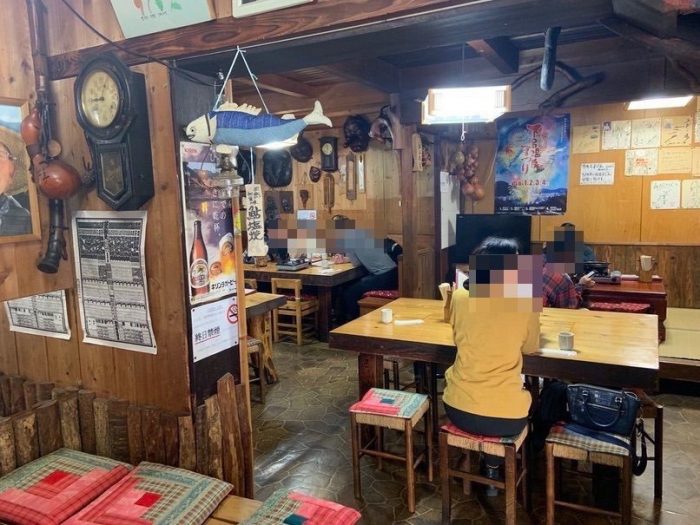 店内は、民芸品を飾った山小屋風になっていて、お座敷の席は3席ほど、テーブル席は4席ほどとなっています。